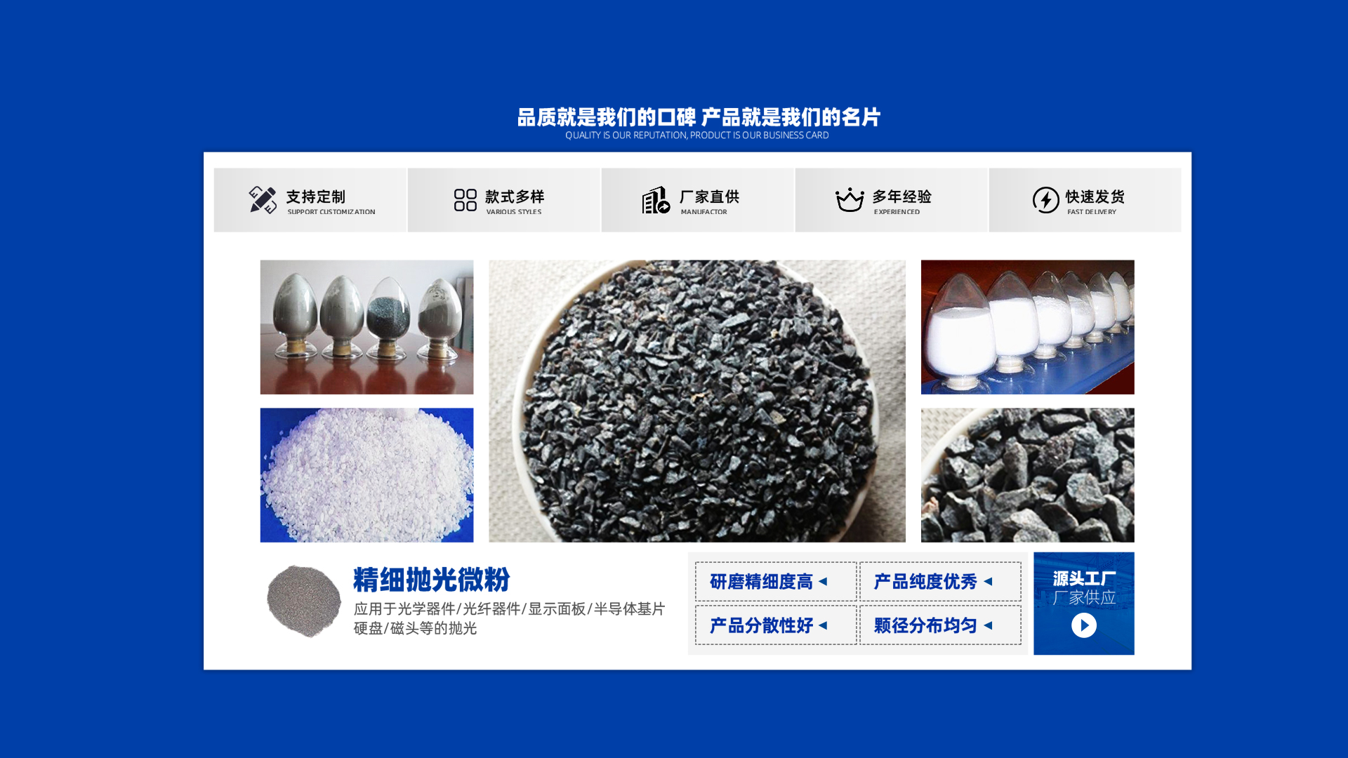 公司另外提供陶瓷砂輪專用砂,粒度有8#、10#、12#、14#、16#、20#、 24#、30#、36#至325#各種目數(shù)均可提供。是砂輪廠、耐火材料廠、噴砂、除銹廠的產(chǎn)品。